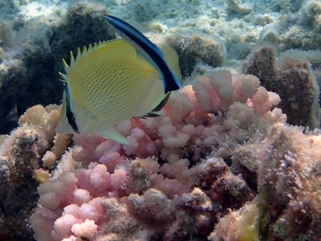 A butterfly fish getting a quick cleaning by a cleaner wrasse.