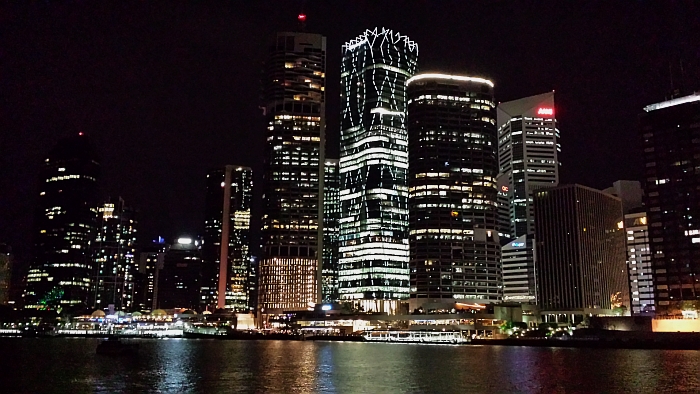 We are all chatting and having a good time on the largest boat on our dock, which is used for any kind of get together and to store all of our bicycles. We are munching from a table overloaded with savory and sweet treats and Shawn even brought some fine steaks from the barbie1 for our potluck. Of course his feline companion "Mello" follows him and quickly becomes the center of attention. Cats are naturally very graceful and this seems to become even more apparent on a moving boat. Most of us have to hold on to the rail while moving along the upper deck when the city ferry flies by (ignoring the speed limit around the marina), because it produces such a large wake that the boat rocks violently from side to side as if we were out at sea. Mello, however, just swaggers across the rail on the upper deck, jumps down onto the lower level and disappears in the forward hatch without a single lapse, despite the motion of the boat. It seems cats are the better sailors after all. :-) It's a pretty night with a near full moon, a slight breeze, and no mozzies2 so we finish the evening off with a short walk around the tip of Kangaroo Point enjoying the great views of the city lights reflected in the river.