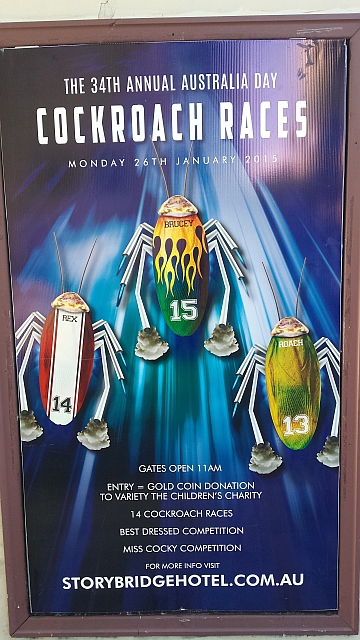 But sometimes you don't need to venture far from home. On January the 26th, Australia Day, the action was only 5 min away from the marina at the Story Bridge Hotel. The hotel was hosting the 34th annual Australia Day cockroach races in their parking lot. Each race starts with the announcement of the names of all 30 cockroach contenders; the names range from very sophisticated to rather foul-mouthed, most playing on the words “cock” and “roach.” A jar containing the cockroaches is brought in with an escort of kilt clad bagpipers. The race starts once all the contenders are brought to the middle of the ring and the jar is lifted. Official roach judges are positioned all around the arena and whichever cockroach reaches the edge first is declared the winner. Every roach is labeled with a little number to make them easier to identify. Luckily you don't have to bring your own home-raised roach and can by a trained race roach at the event for a small fee. The money from the races goes to a local charity and the hotel makes quite some profit too, since the unofficial rules say you have to have a beer during the roach races. The races start every half hour and run for the entire afternoon. It was tough but we tried to uphold the local customs.;-)